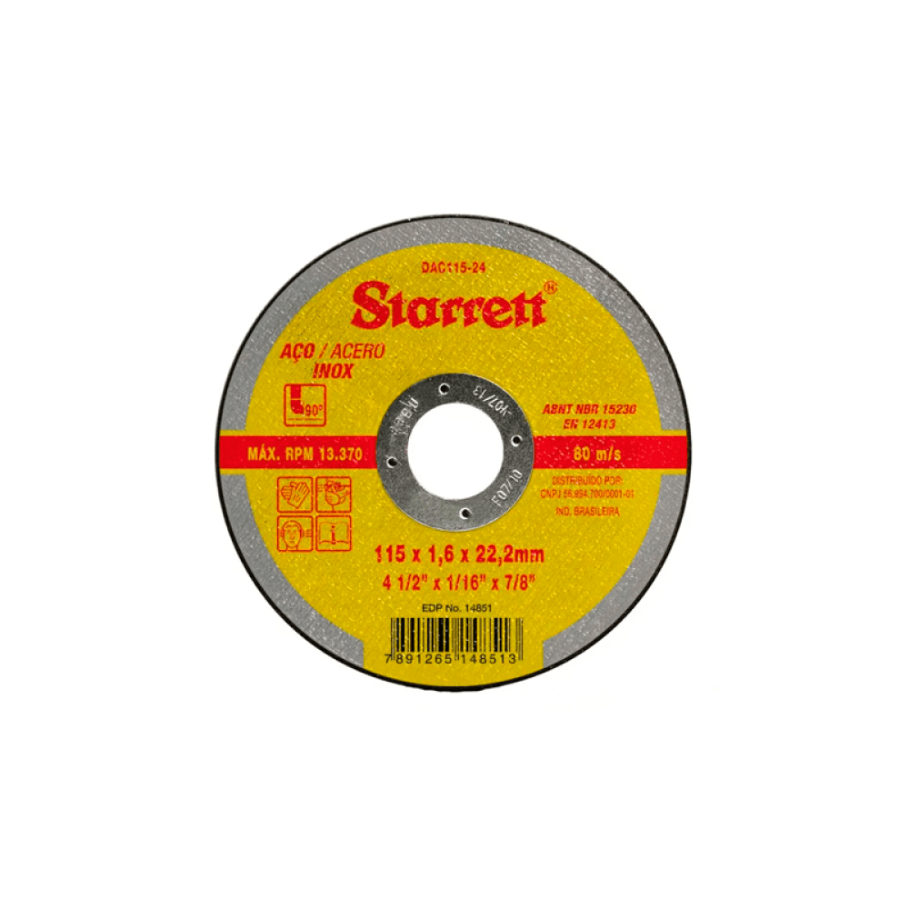 Os Discos Abrasivos de Corte Categoria Starrett são fabricados em conformidade com as normas EN 12413 e NBR 15230. São ideais para o corte de materiais em aço carbono e aço inox, incluindo tubos, chapas, perfis, barras e outros materiais ferrosos. Este produto é especialmente recomendado para uso em serralherias, construção civil e oficinas.