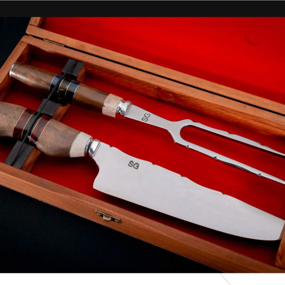 Lindo conjunto para seu churrasco, vem na caixa de madeira. Faca com lâmina mais larga e 5mm de espessura, garfo também com 5mm de espessura sendo forte e resistente.